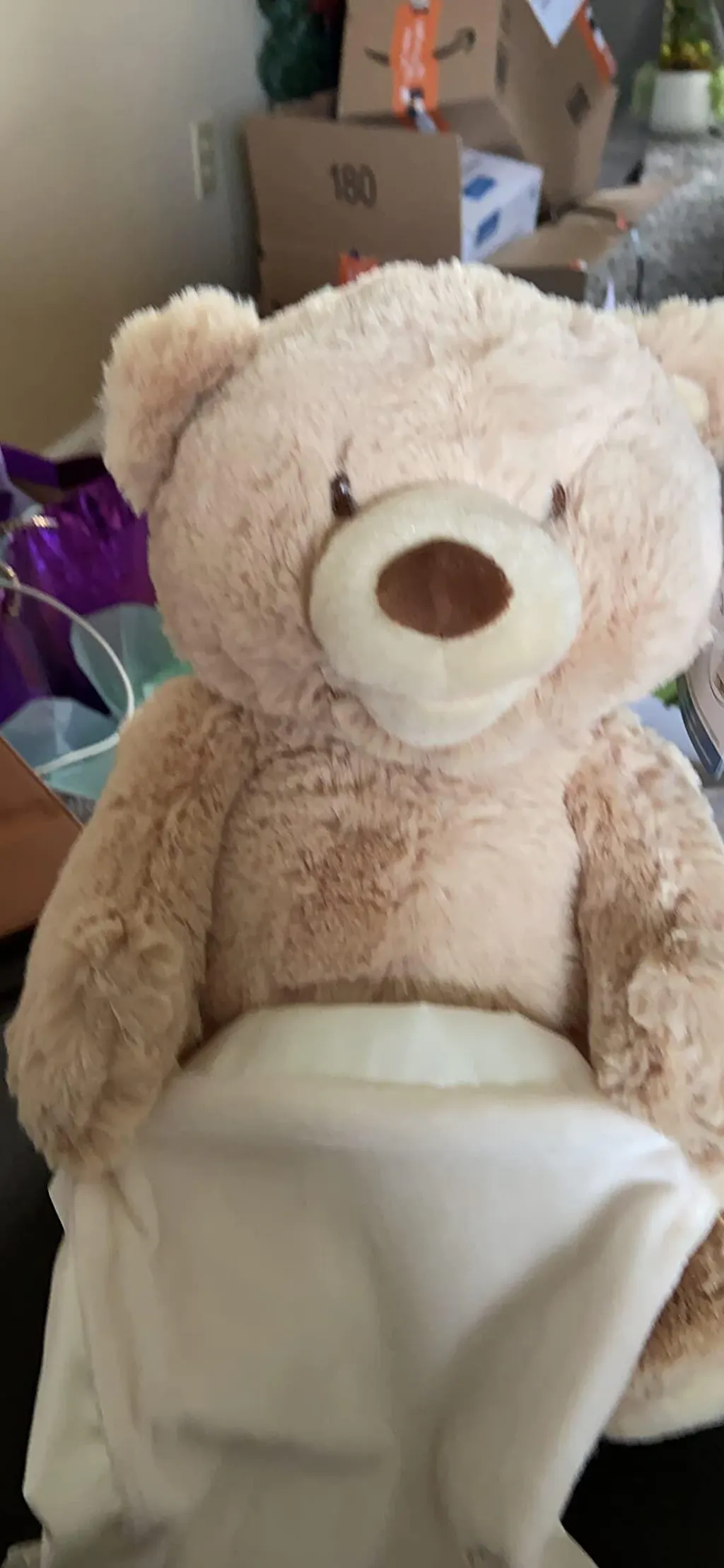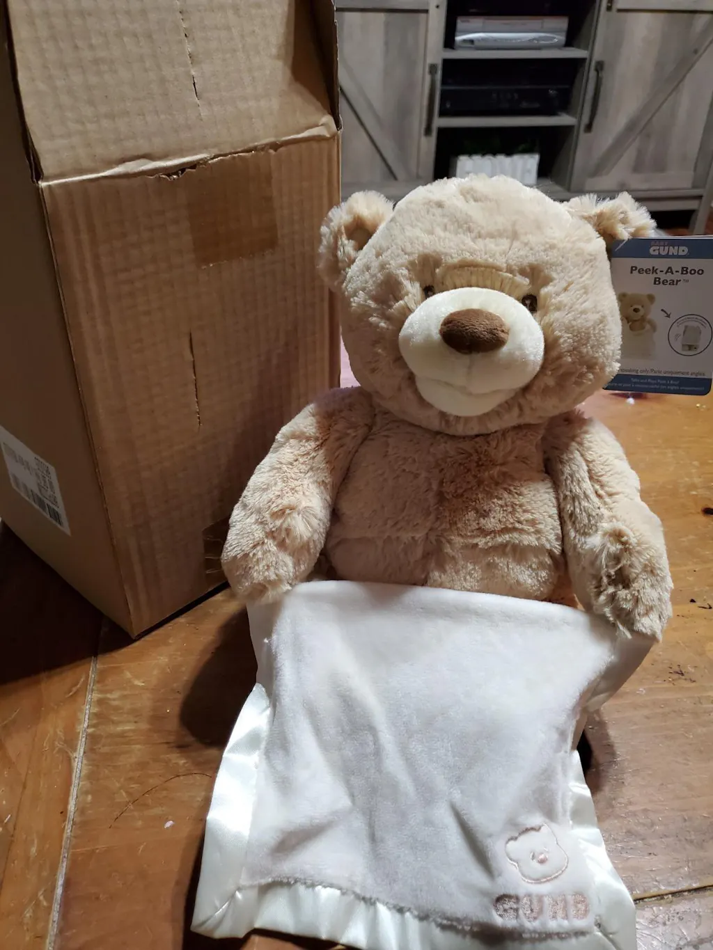 Peek-A-Boo Bear recites one of six different phrases while animated mouth and arms recreate peek-a-boo game. Features a satin-accented blanket that provides additional tactile sensation.